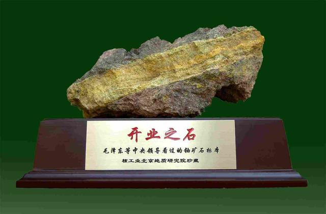 该标本 1954年采集于广西。1955年1月15日,地质部刘杰副部长将这块铀矿石带到了中南海,向毛泽东主席等中央领导进行了展示与汇报,毛主席说:“这是决定命运的……”该标本为党中央作出建立原子能事业的战略决策提供了重要依据。因此被誉为中国原子能事业的开业之石。